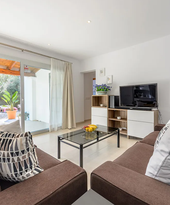 Bonita casa pareada en Cala Vadella con 2 dormitorios, 2 baños, 1 sofá cama doble y terraza, ubicada dentro de un club vacacional, conveniente para trabajar de forma remota, provisto con buen WIFI, este acogedor lugar está a poca distancia de la playa de Cala Vadella, con cocina en concepto abierto, sala y comedor.