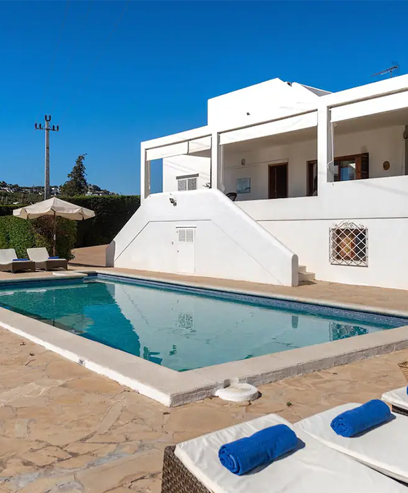 Villa ibicenca, especial para familias o grupos, provista de 4 habitaciones dobles y 3 baños, con piscina grande y privada con agradables zonas exteriores, cerca de la playa de Talamanca y también de Cala Llonga, a solo 5″ minutos en coche a varios clubes de la ciudad de Ibiza como Pacha y más, buena zona ajardinada con barbacoa (CARBÓN).