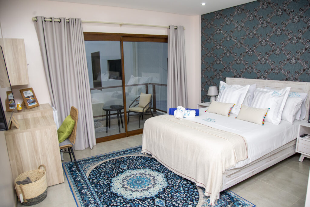 Habitaciones, Suite PremierLa Suite Premier Topacio Azul te da la bienvenida con un ambiente sereno y luminoso, inspirado en la frescura y elegancia de su nombre. Espaciosa y cuidadosamente equipada, ofrece el equilibrio ideal entre confort y estilo, creando el escenario perfecto para una estadía relajante y memorable.Gs 480,000 por noche